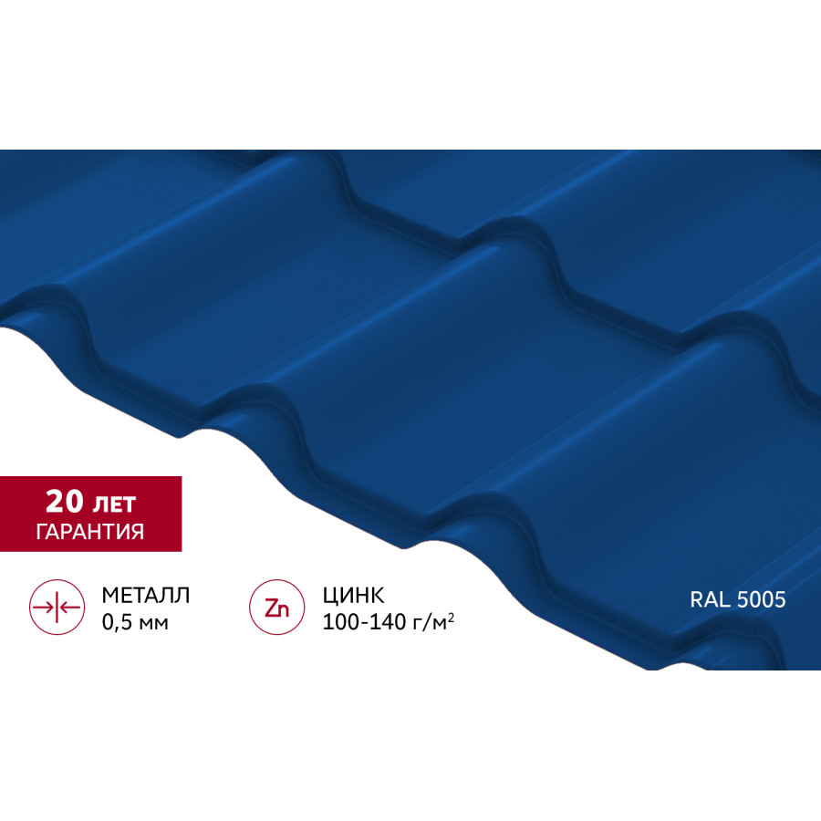 Металлочерепица "Камея" ("Kamea") v01 0,5 Satin RAL 5005 сигнальный синий