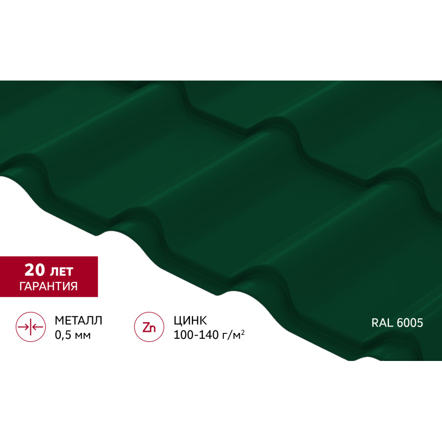 Металлочерепица "Камея" ("Kamea") v01 0,5 Satin RAL 6005 зеленый мох