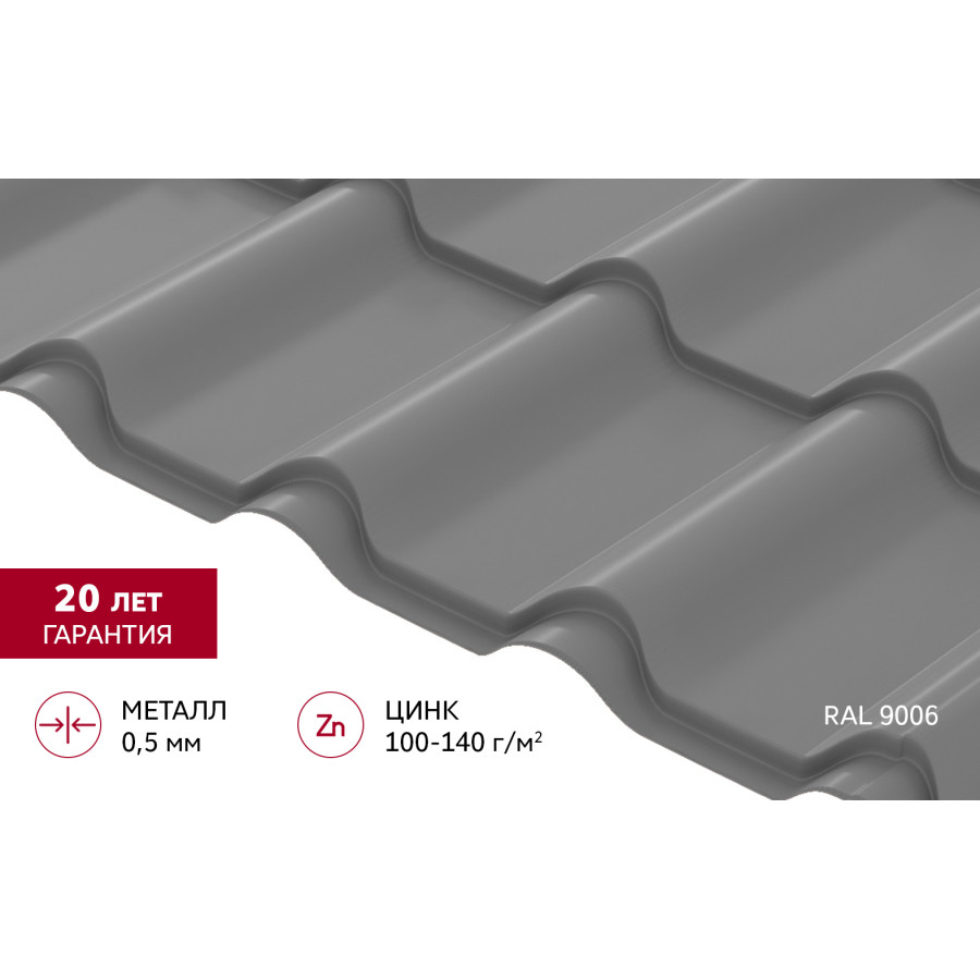 Металлочерепица "Камея" ("Kamea") v01 0,5 Satin RAL 9006 бело-алюминиевый