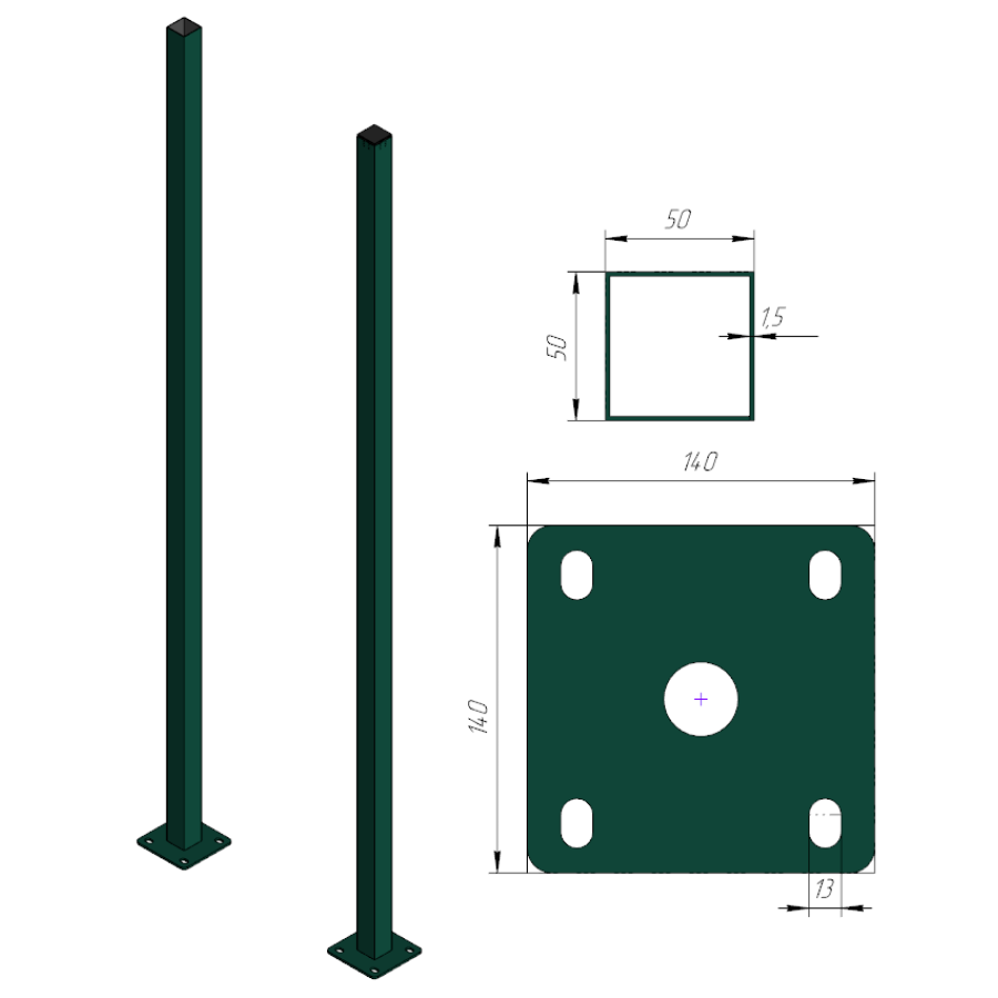 Столб с фланцем -изготовлен из горячекатанной профильной трубы, сечением 50х50мм, с приваренным фланцем 140х140х4мм (в стандартном исполнении), окрашен порошково-полимерным покрытием в цвет по каталогу RAL.