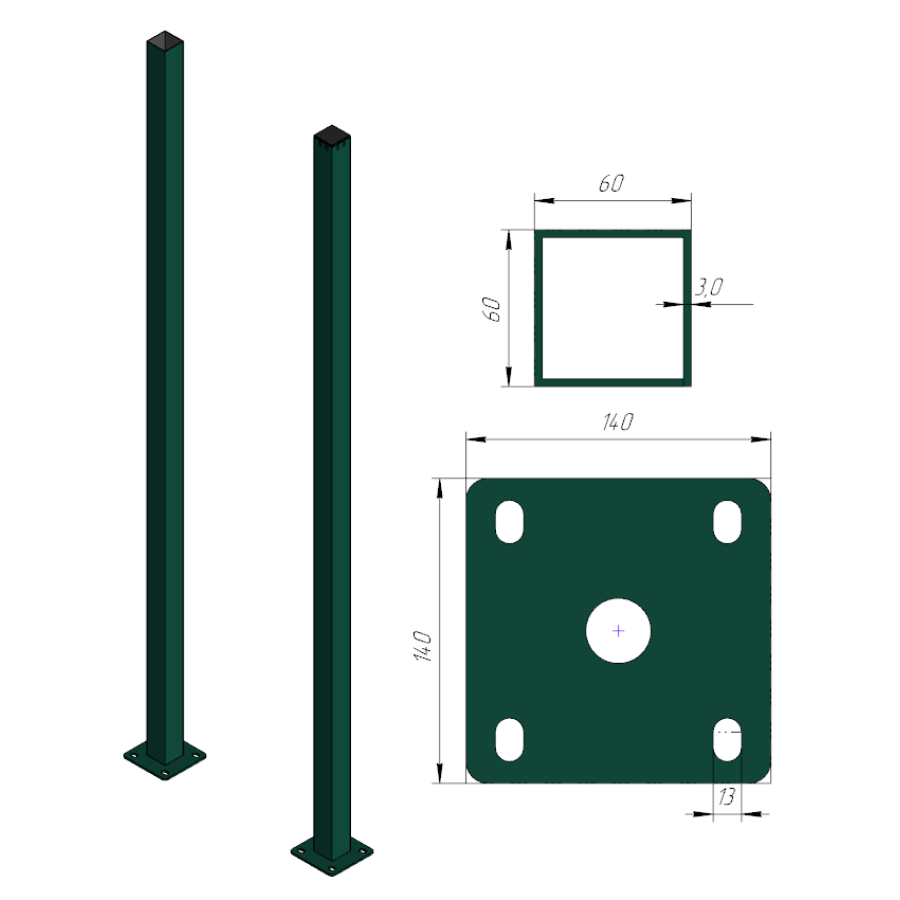 Столб с фланцем -изготовлен из горячекатанной профильной трубы, сечением 60х60мм, с приваренным фланцем 140х140х4мм (в стандартном исполнении), окрашен порошково-полимерным покрытием в цвет по каталогу RAL